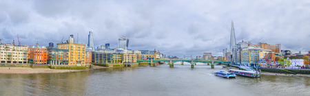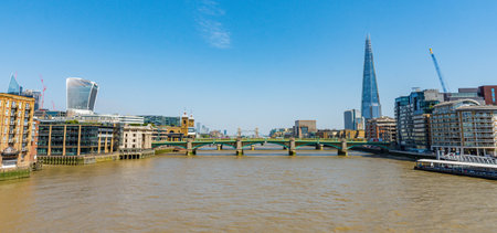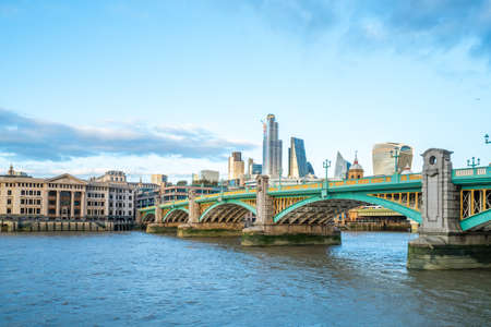 London - October 2019: view of the Thames and Southwark Bridge - a beautiful arched bridge, City of London skyscrapers are visible in the background.