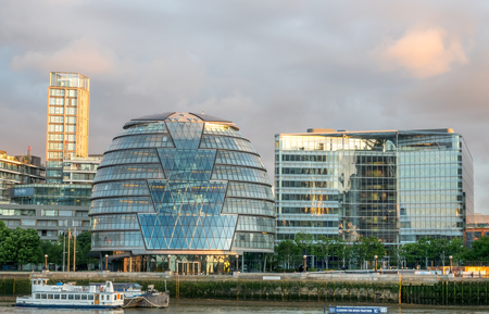 LONDON - MAY 24: City Hall building along river Thames with surrounding buildings in London, England, was taken on May 24, 2016.