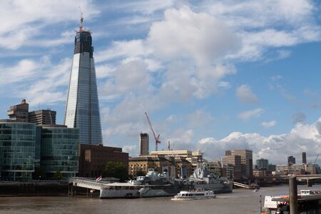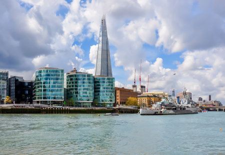 Shard skyscraper and Belfast battleship on Thames river, London, UK