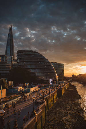 Thames River Embankment, London | UK - 2021.06.26: The view of the Shard and City Hall from the Tower Bridge with a beautiful sunset in the background