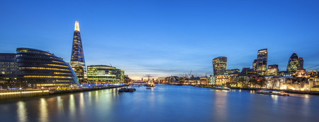 London, UK - June 22, 2019: Panoramic view of modern office and residential buildings on Thames riverside in London Bridge, seen from famous Tower Bridge during blue hour.