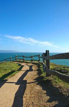 Lonely hiking trail along a coastal cliff, space for text in the wide-open ocean view.