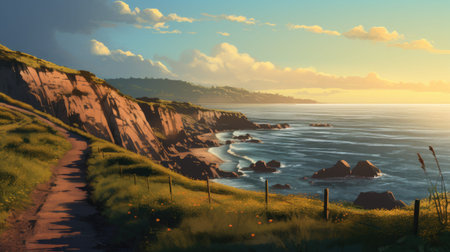 coastline hiking trail showcasing vibrant colors of yellow, blue, pink, and black. the strong shadows and golden light create a captivating atmosphere. this pastel-inspired, award-winning illustration captures the beauty of the trail with high quality and intricate detail. shot with a zoom lens and inspired by the works of ansel adams and andrew tischler, this photo showcases the stunning scenery and the unique film aesthetic