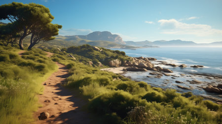 AI Generated. Coastal Path Along Rocky Cliffs Overlooking a Cove and the Sea