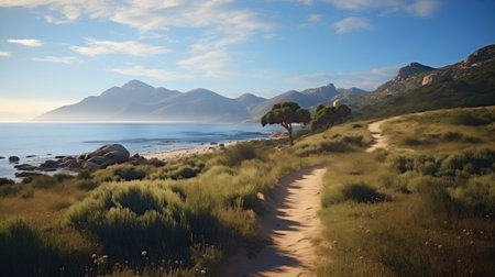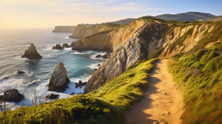 the headland hiking trail features a captivating mix of yellow, blue, pink, and black hues, casting strong shadows under the golden light. this award-winning illustration captures the pastel beauty in high detail, reminiscent of ferrania p30 film. the zoom lens perspective echoes the mastery of ansel adams and andrew tischler in this poetcore scenery. ai generated