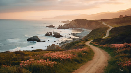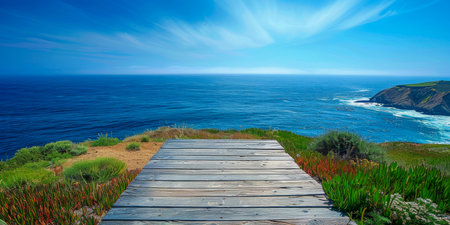 A picturesque coastal pathway lined with vibrant wildflowers, leading to a stunning ocean view beneath a clear blue sky, inviting exploration and serenity.