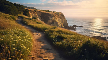 A peaceful pathway meanders along the cliffs overlooking a calm ocean, showcasing the beauty of nature with golden grass swaying in the sunlight.