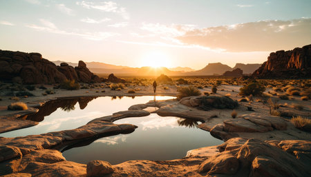 Hiker exploring a desert landscape with cacti and mountains at sunset. Ai generated image