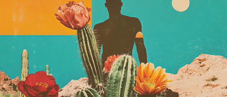 Collage of a resilient figure surrounded by vibrant cactus flowers in a desert landscape