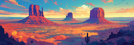 Panoramic landscape of Monument Valley at sunset. Vector illustration.