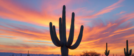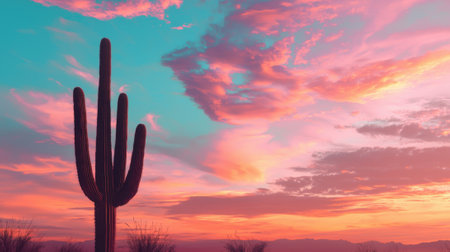 Colorful sunset illuminates the sky with shades of pink and blue as a tall saguaro cactus stands proud in the desert. This tranquil scene captures the beauty of nature.