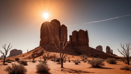 The sun shines brightly on a desert landscape. Generative AI image.