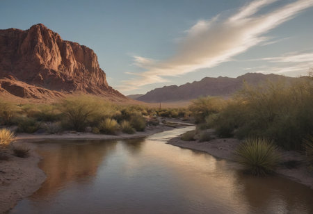 desert landscape with water, realistic illustration