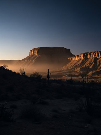 A vast desert landscape at dawn or dusk, featuring a prominent mesa illuminated by golden light, with silhouetted cacti and arid vegetation in the foreground.