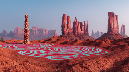An arid landscape features imposing red rock formations under a clear blue sky. A detailed, colorful pattern is painted on the foreground ground. The scene is illuminated by sunlight creating a contrast of shadows and highlights. The image could be used for conceptual or illustrative purposes.