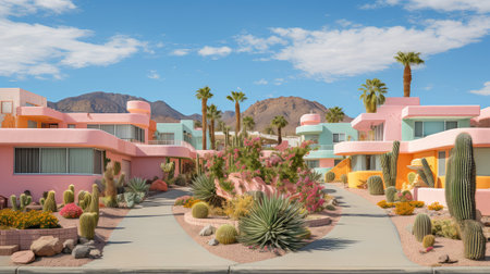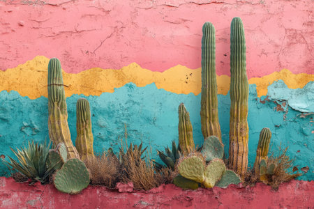 Blooming cactus is standing out in a surreal pastel-colored desert landscape against a textured wall