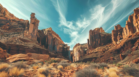 Panoramic landscape view of beautiful red rock canyon formations during a vibrant sunny day