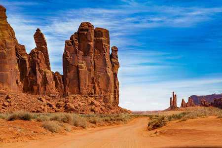 Dirt Road in a Desert Rocky Mountain American Landscape. Morning Sunny Sunrise Sky. Oljato-Monument Valley, Utah, United States. Nature Background