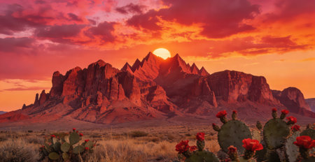 AI Generated. Silhouette of Blooming Cacti on Desert Cliff at Sunset
