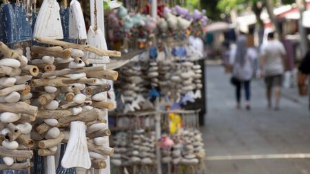 Handicrafts detail with a blurred view of bazaar in old Datca Turkey