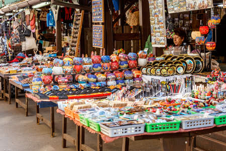 Jerusalem Israel December 17, 2019 View of various decorative objects sold in a souvenirs shop at the bazaar of the Old city of Jerusalem in the morning