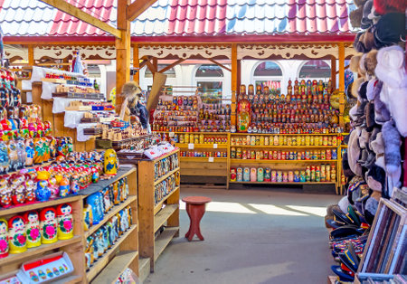 ST. PETERSBURG, RUSSIA - MAY 26, 2016: Traditional Russian souvenirs on display on a street shop.