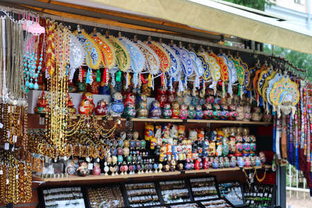 Showcase with fridge magnets. Shopping and travel concept. Souvenirs from Istanbul, Turkey. 2019-08-13