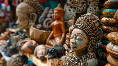 Balinese market. Souvenirs of wood and crafts of local residents. Colorful Souvenirs and figurines. Bali, Indonesia.