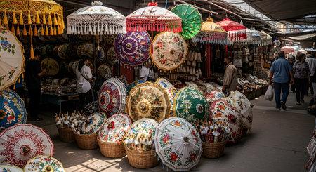 A bustling outdoor market stall in Asia, likely Thailand, sells a large variety of colorful, hand-painted paper umbrellas and parasols. The traditional umbrellas are displayed in baskets and hanging, with shoppers browsing in the background.