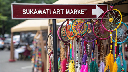A vibrant display of colorful dreamcatchers and beaded necklaces welcomes visitors to the famous Sukawati Art Market in Bali, Indonesia. This bustling market is a perfect spot for unique handcrafted souvenirs and local crafts, with a clear sign guiding the way to its lively stalls.