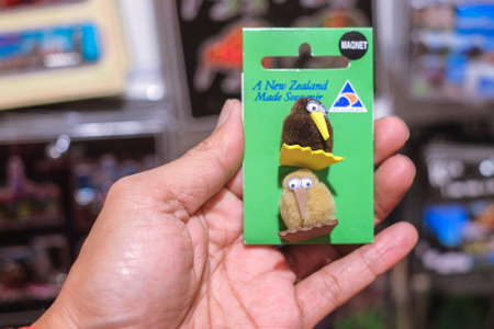 Christchurch, New Zealand – December 19th, 2017 : Man holding New Zealand fridge magnet souvenir in DP Souvenir shop at Christchurch, New Zealand.