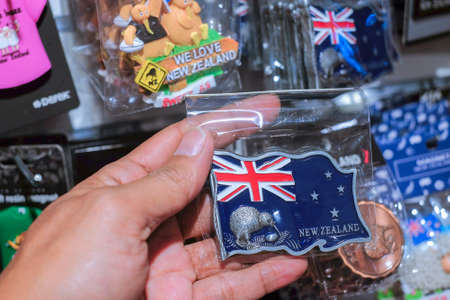 Christchurch, New Zealand – December 19th, 2017 : Man holding New Zealand flag souvenir fridge magnet in DP Souvenir shop at Christchurch, New Zealand.