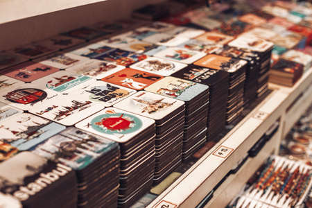 Showcase with fridge magnets. Shopping and travel concept. Souvenirs from Istanbul, Turkey. 2019-08-10