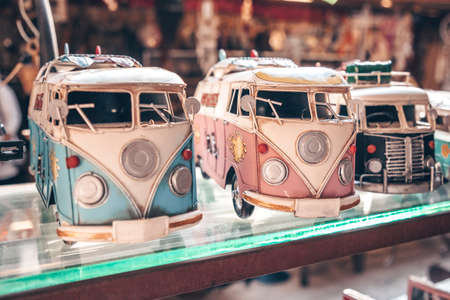 Big collection of retro car models on the shelf. Miniatures of colorful vintage vehicles in the shop. Turkey, Istanbul, 2019-08-18