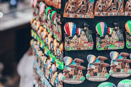 Showcase with fridge magnets. Shopping and travel concept. Souvenirs from Cappadocia, Turkey 2019-08-14.