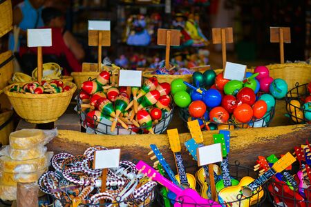 Ancient Mexican-themed souvenir shop. Typical Mexican embroidery craft on sale at a souvenir shop.