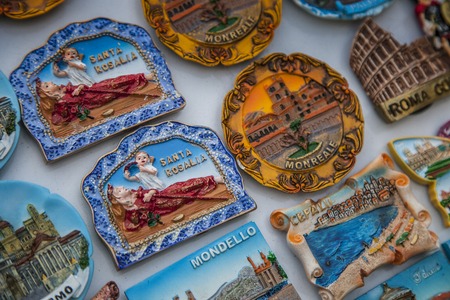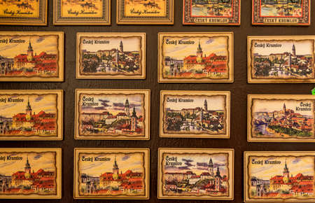 Sale of magnets, postcards, bottle openers, bookmarks, calendars, key rings and other souvenirs on street of Montenegro towns. Gift and keepsakes for self, friends and relative from travels