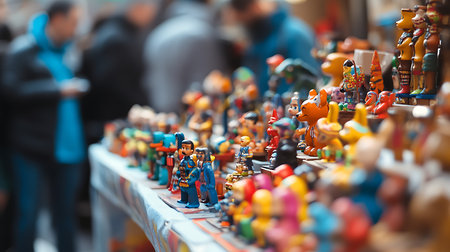 Artisans display colorful figurines at a vibrant market celebrating local culture and craftsmanship.