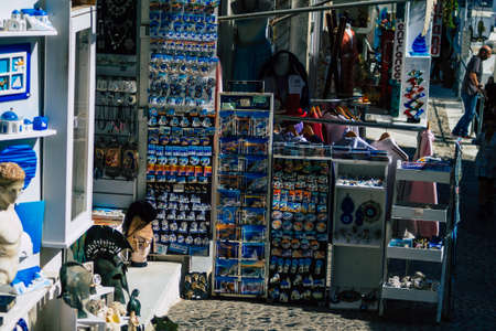 Santorini Island, Fira, Greece - October 23, 2021 Decorative objects, accessories and goods sold to tourists in souvenir shops of Fira, tourist town and capital of Santorini in the Greek Islands