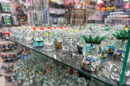 New York, United States - September 20, 2019: Collection of crystal snow balls for sale in a souvenir shop in Manhattan.