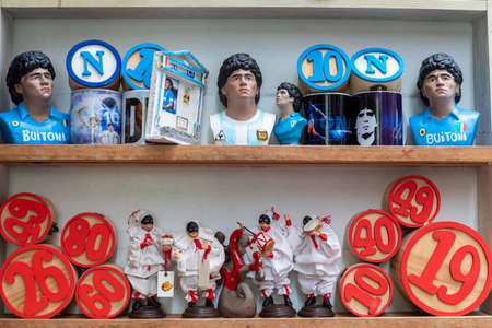 Naples, Italy - December 24, 2021: objects composed of pulcinella, bingo numbers, statuettes of Maradona, typical of the Neapolitan culture.