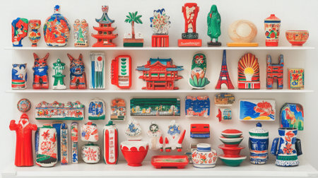 Explore a vibrant assortment of decorative objects and figurines highlighting cultural heritage and artistic craftsmanship, perfect for adding color and charm to any space.