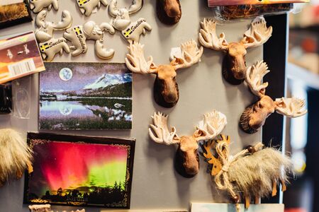 Traditional souvenirs and gifts from Kiruna, Sweden - mugs, fridge magnets, badges, hand made toys, cheese cutters, Lapland, Norrbotten County