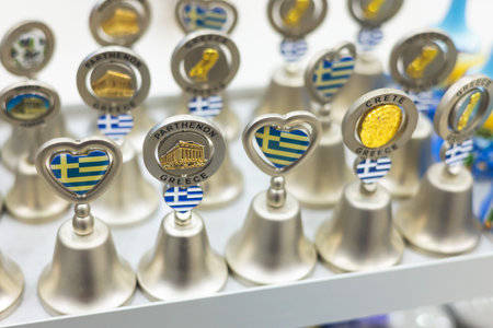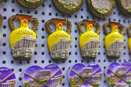 View of traditional tourist souvenirs and gifts from Athens, Attica, Greece with fridge magnets with text Greece, Athens and key ring keychain, in a local vendor souvenir shop in Monastiraki