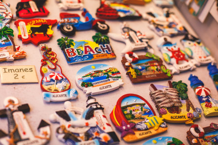 View of traditional tourist souvenirs and gifts from Spain, Alicante, Valencia with toys, bull figures, flamenco dancer dolls, fridge magnets with and key ring keychain, in local vendor souvenir shop