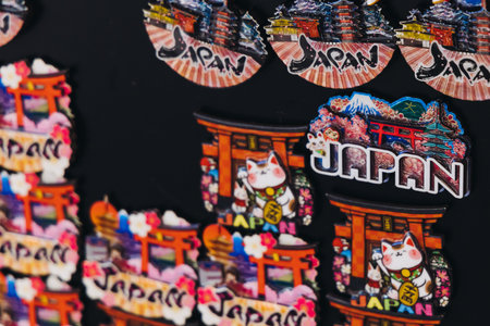 Traditional Japanese tourist souvenirs and gifts from Tokyo, Japan, with mount Fuji figures, refrigerator magnets, Maneki-neko beckoning cat figurine, key ring keychain, in a local vendor gift shop