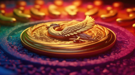 3d illustration of golden medal with wings over colorful background. victory concept
