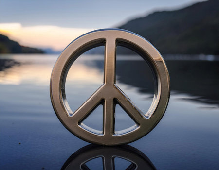 Floating peace symbol over calm water surface, Ai generated image