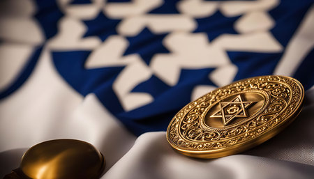 A golden Star of David medallion placed on a folded Israeli flag, symbolizing Jewish heritage and pride.
