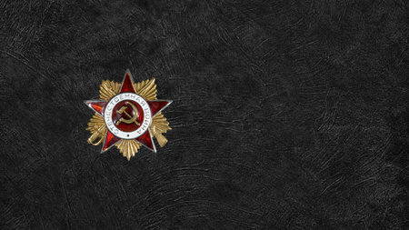 Against a dark background Soviet award Patriotic war of the first degree.Date: 18.04.2018 years. Editorial image.Close up. Indoors. Vignette. Horizontal format. Color. Photo.